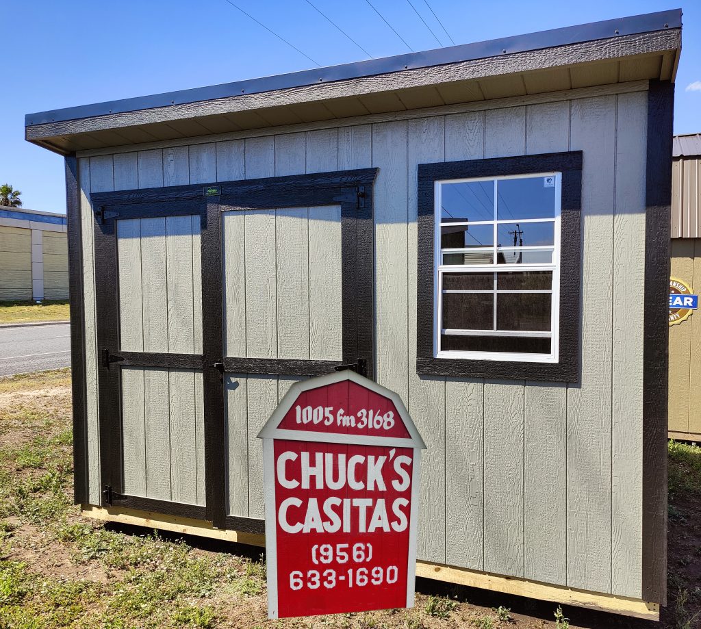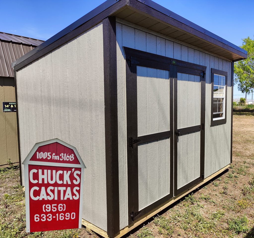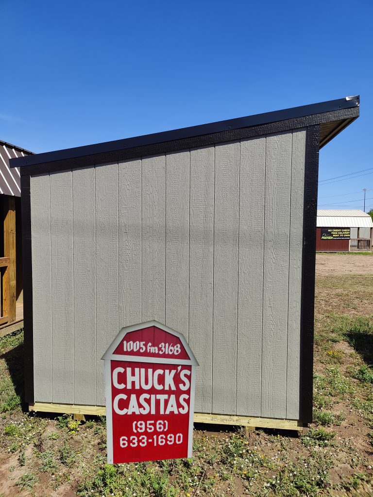 8 x 12 (96 square feet) Cottage Shed with Gray Siding and Black Trim and Roof. The standard design comes with a 70 inch double door and a 2×3 window with bug screen as shown below.
